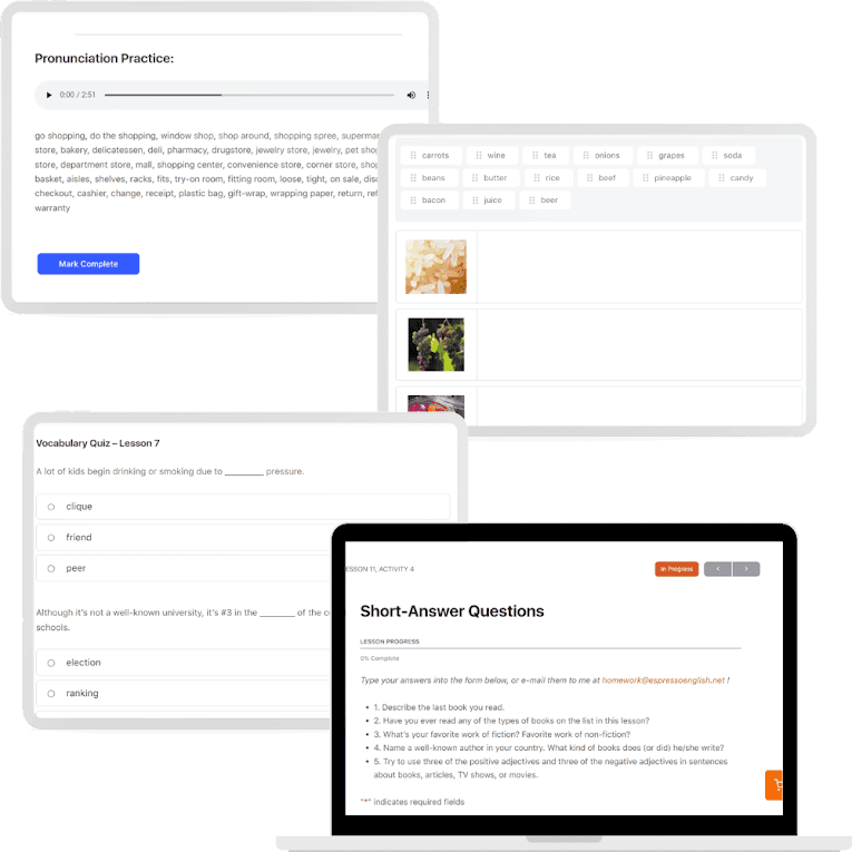 Review & practice your new vocabulary with quizzes inside every lesson and short-answer questions to help you use the new vocabulary in your own English.